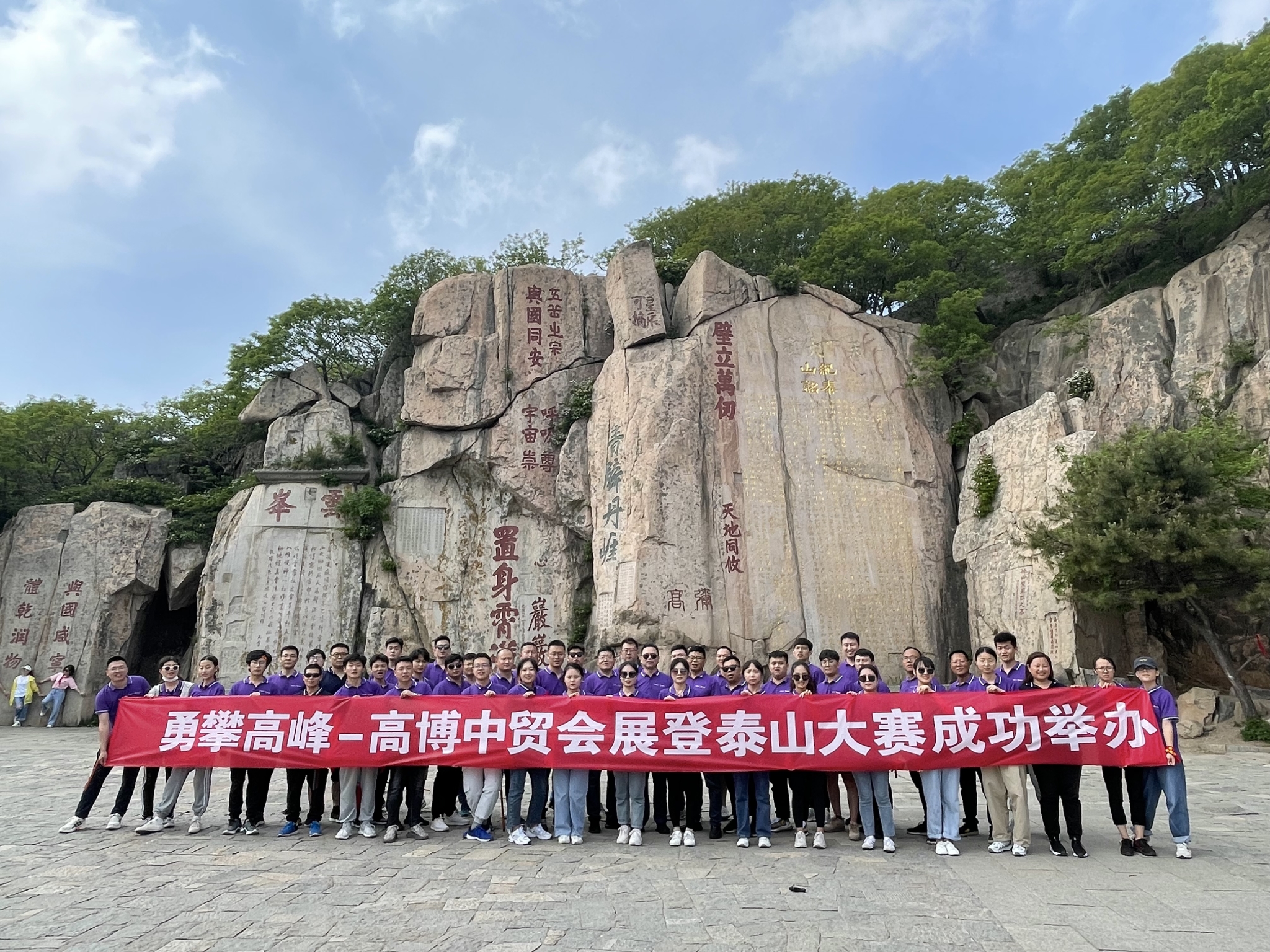 5月31日早,全體員工統(tǒng)一著工裝,乘坐大巴前往泰山,員工們熱情高漲,到達中天門后開始徒步登山,在中貿(mào)集團(高博中貿(mào)國際會展集團)董事長杜磊的帶領(lǐng)下,向玉皇頂發(fā)起沖鋒。1532.7米的海拔,3000余級臺階,中貿(mào)家人們齊心協(xié)力,一路同心,終登泰山之巔。“會當(dāng)凌絕頂,一覽眾山小”,此次泰山之行也讓中貿(mào)人切實感受到,堅持是最大的力量,只有不斷接受新的挑戰(zhàn),勇于突破,才能看到更美的風(fēng)景。登高望遠,高博中貿(mào)國際會展也將再續(xù)新發(fā)展,再啟新征程!